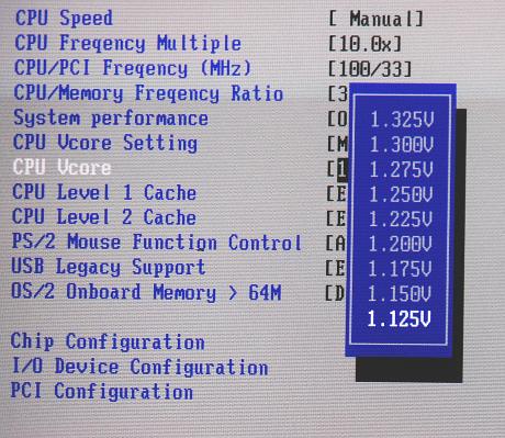 Hierzu habe ich ein Motherboard von ASUS A7V333 getestet. Auf diesem läßt sich die Vcore bis 1,125Volt manuell einstellen. Weiterhin bietet es die Möglichkeit, FSB und Multiplikator in weiten Grenzen zu wählen.