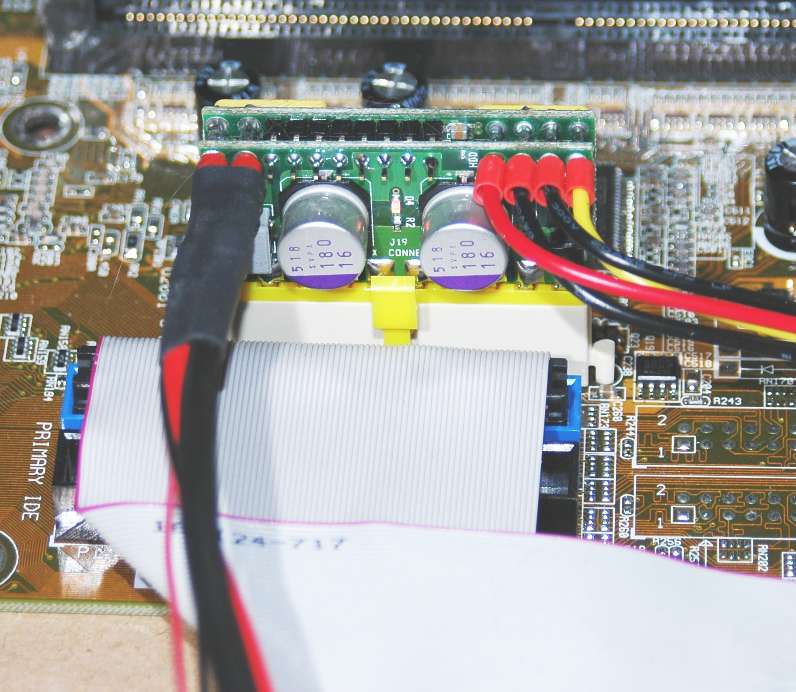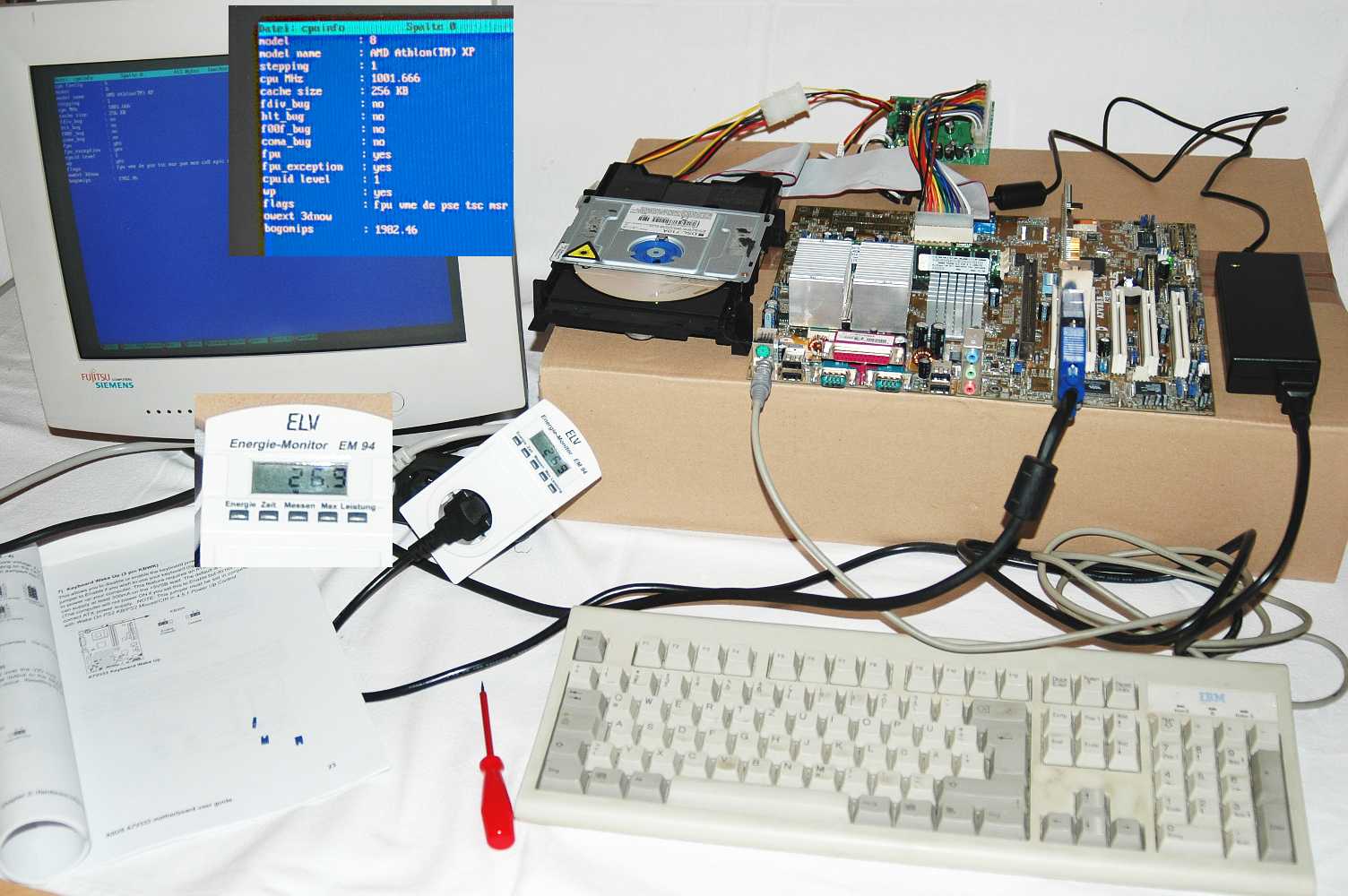 Als Konfiguration (für diesen Testaufbau) dient ein Laptop NT + Board Wandler PW70, Speicher 256MB DDR, Grafikkarte PCI Elsa Gladiac 311 und zum booten des Linux Kanotix 03/05 ein DVD LW DSL 710A sowie eine PS/2 Tastatur. Der Kühlkörper auf der CPU hat die Abmaße 80x60x40 mm.